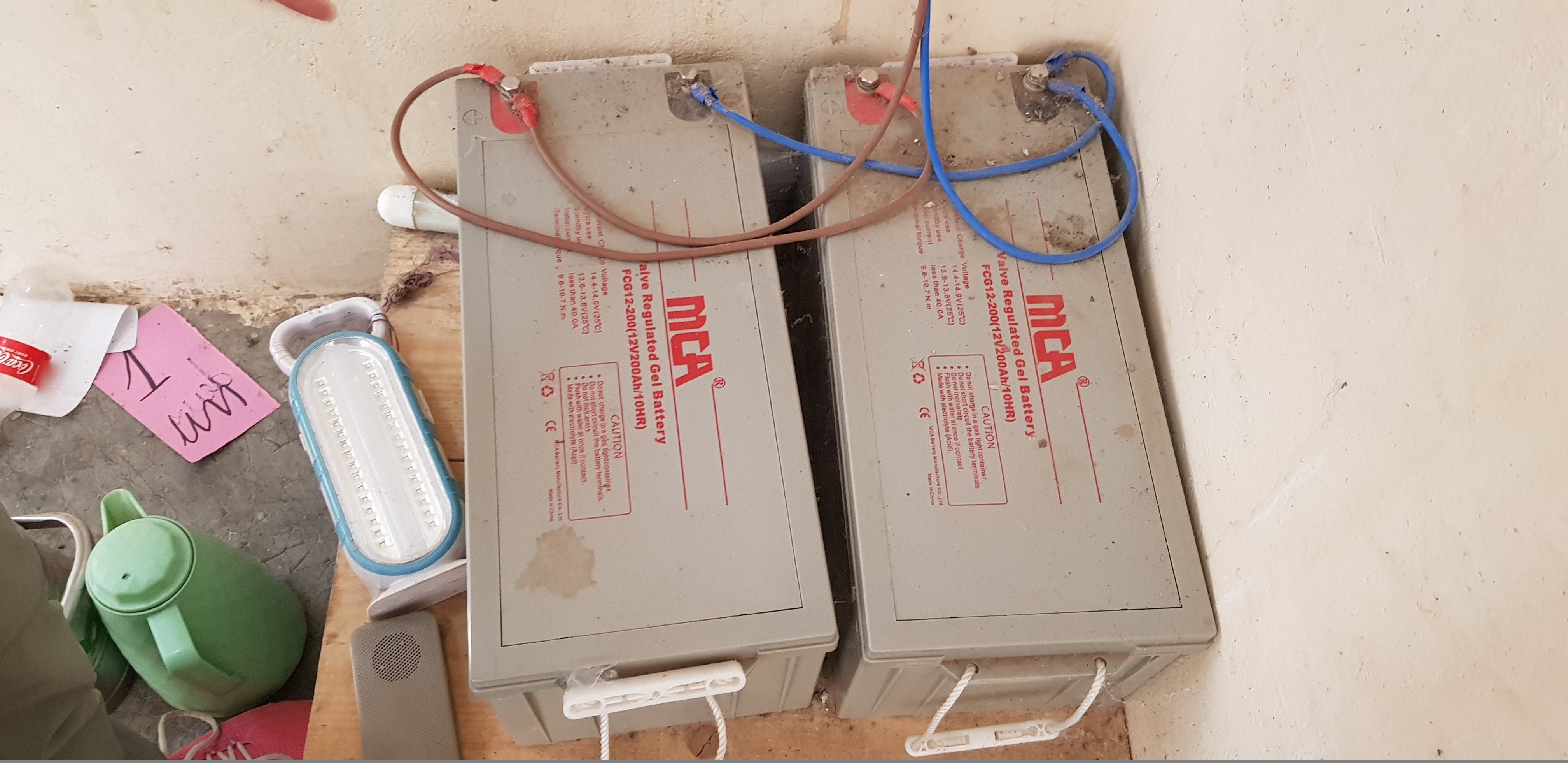 Le aule e tutti gli ambienti della scuola sono alimentati con grande difficoltà dalla corrente proveniente da pannelli solari installati sopra un edificio adiacente all’edificio principale. Questi pannelli poi tramite un inverter, acquistato recentemente, dovrebbero accumulare l’energia sufficiente in una serie di batterie di per alimentare la corrente per l’illuminazione alle piccole utenze di cui necessita la scuola. La maggior parte delle batterie in dotazione alla scuola sono esaurite e su 8 elementi attualmente in dotazione ne funzionano poco e male solamente 2. Quindi in pratica la scuola è al buio.