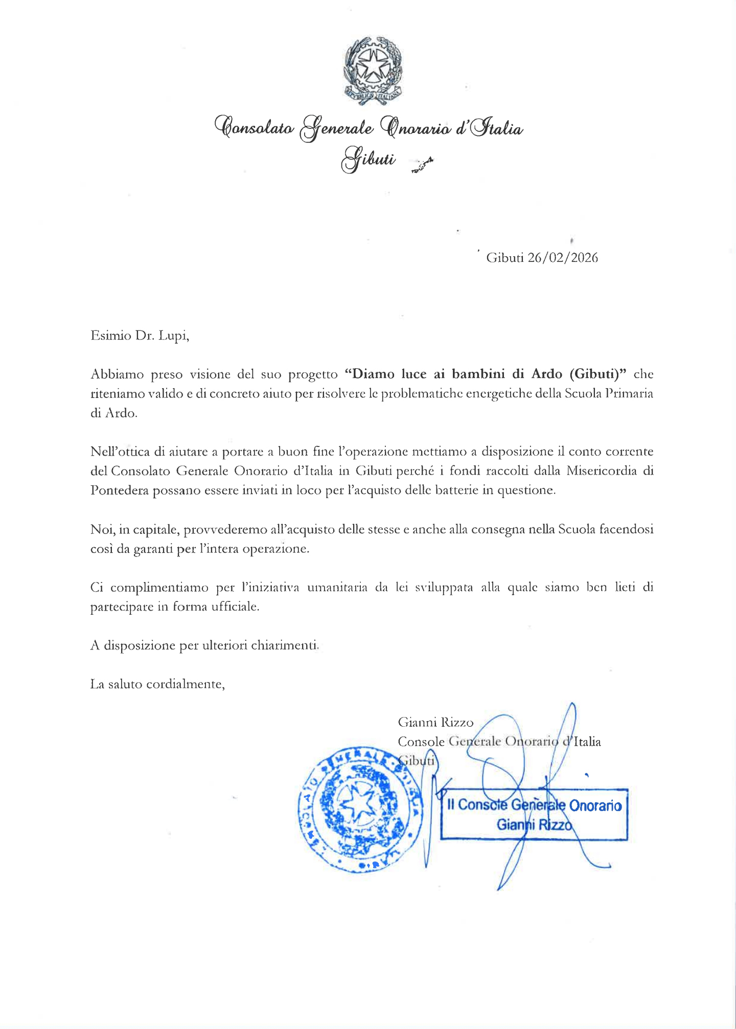 - in seguito ha chiesto anche l’aiuto al console Italiano in Gibuti Gianni Rizzo che ha messo a disposizione il conto corrente del Consolato Onorario Generale d’Italia in Gibuti per ricevere il denaro necessario all’acquisto delle batterie.