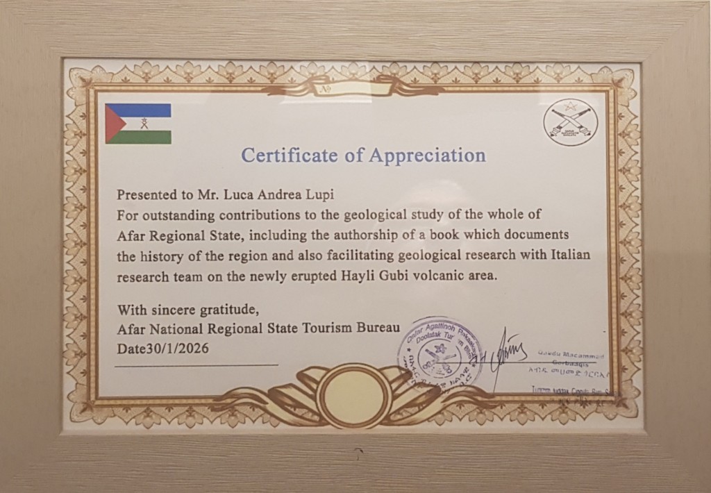 Il 30 gennaio 2026 il Ministro del Turismo della regione Afar ha voluto premiare Luca Lupi con una breve cerimonia dove gli è stato consegnato un attestato di apprezzamento per il lavoro svolto nella promozione del geoturismo in Dancalia, per la realizzazione di volumi che documentano la storia della regione, per la guida alla geologia della Dancalia e per l’impegno nella ricerca scientifica in particolare per aver organizzato la spedizione vulcanologica al vulcano Hayli Gubbi.